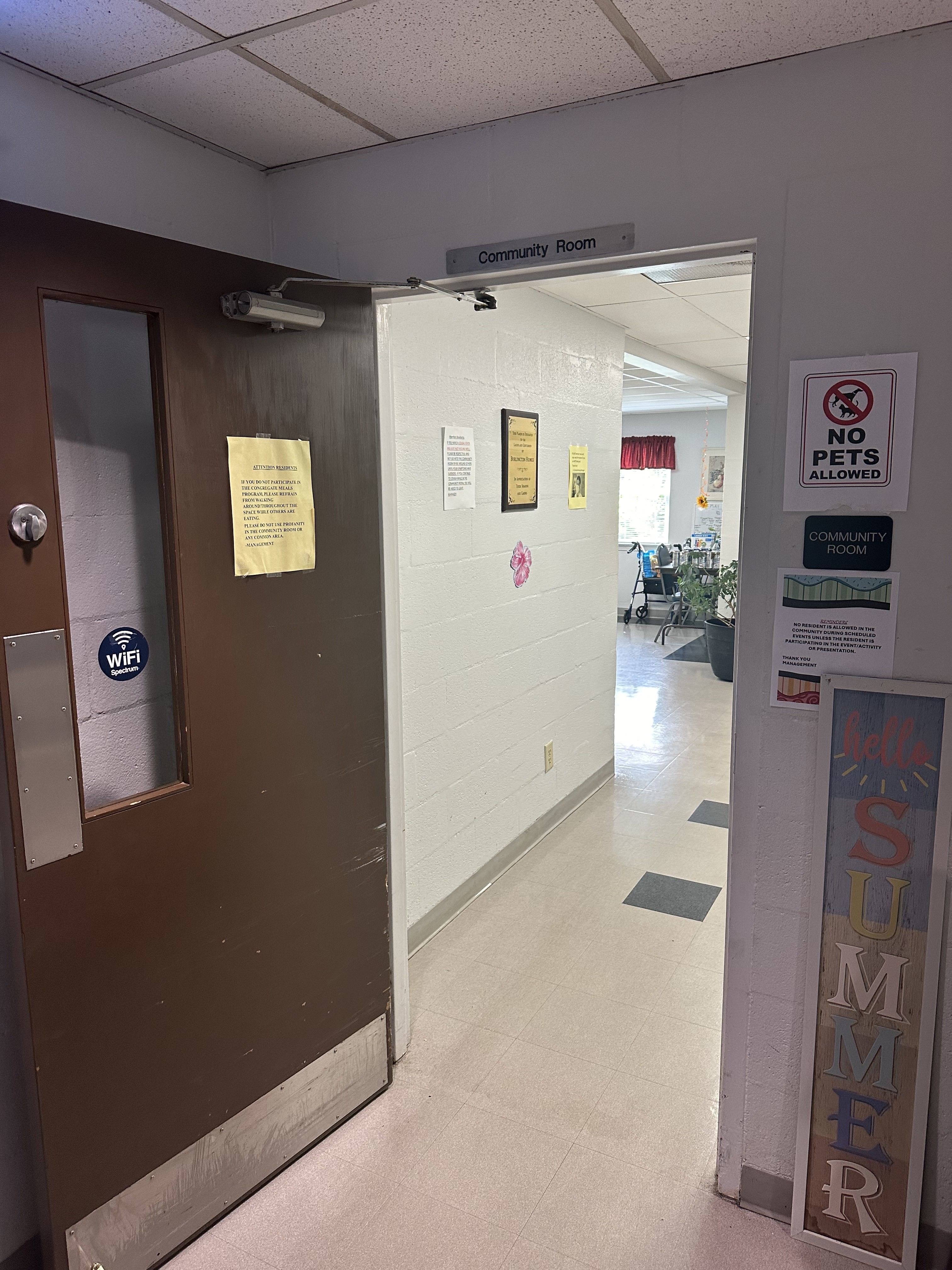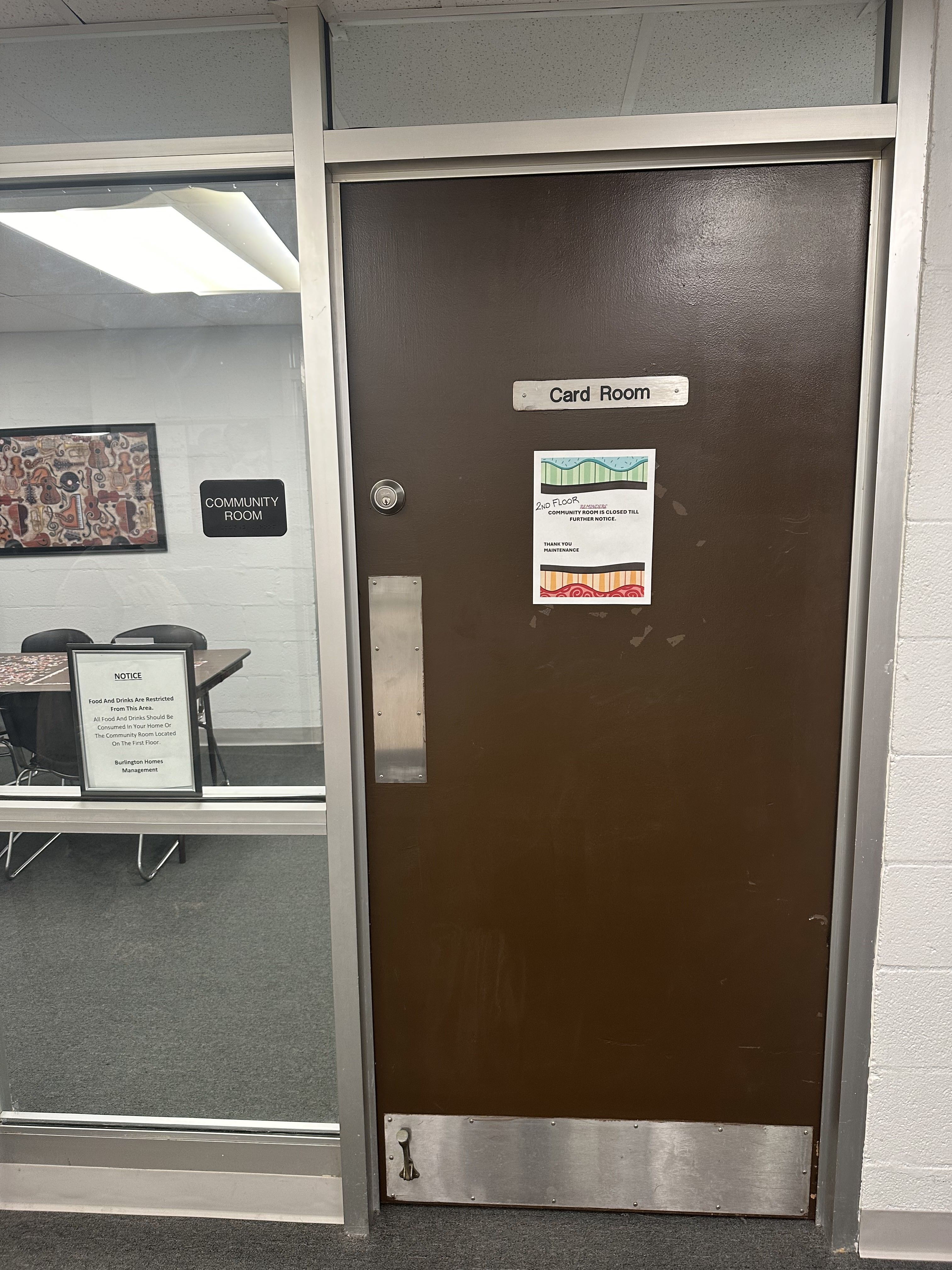 Community room where seniors in Burlington Homes gather to eat and talk.